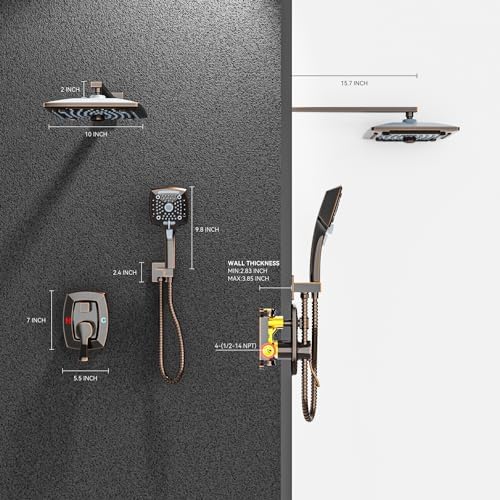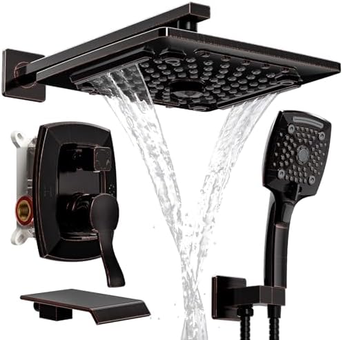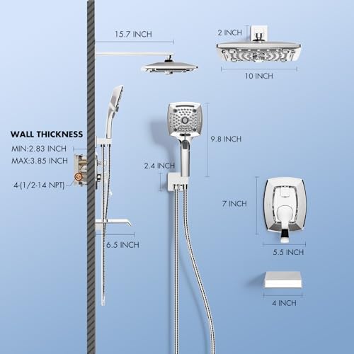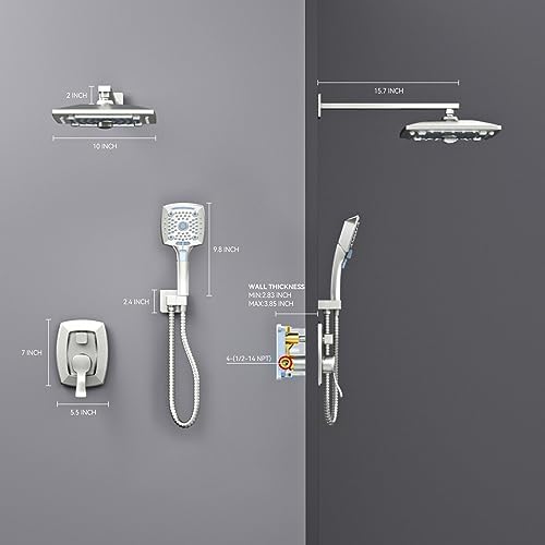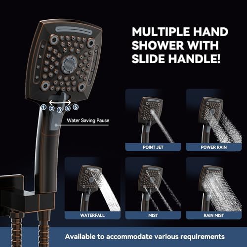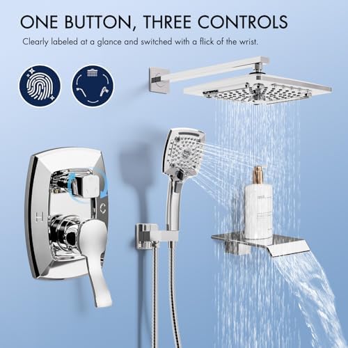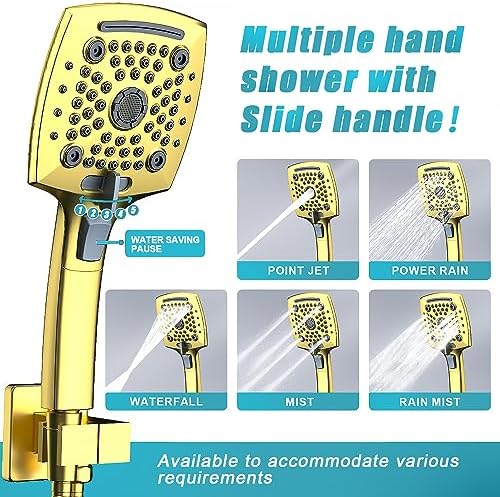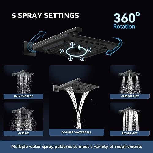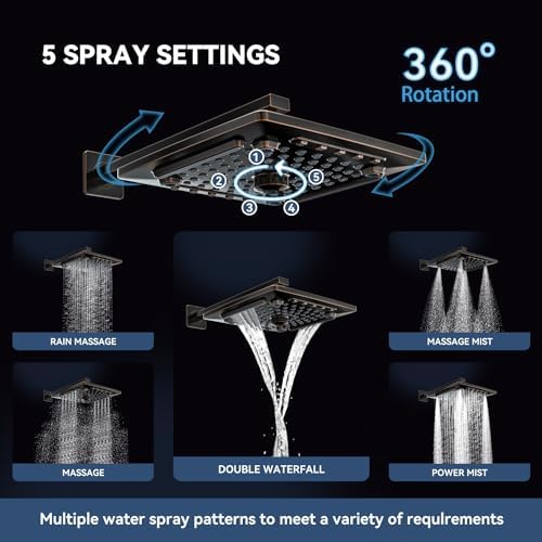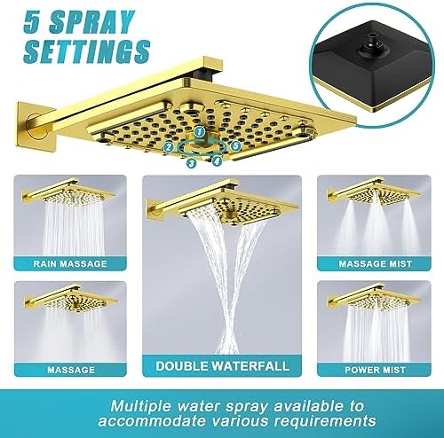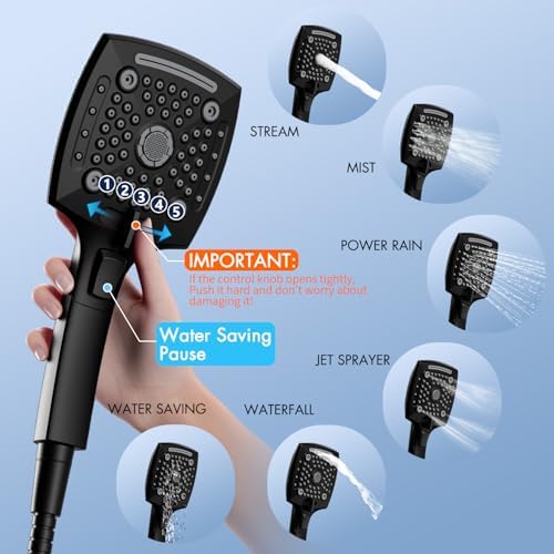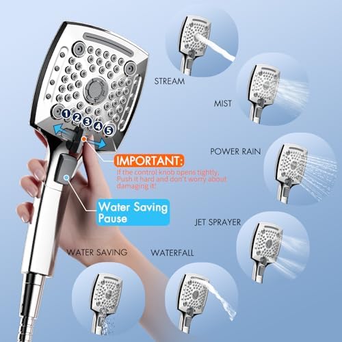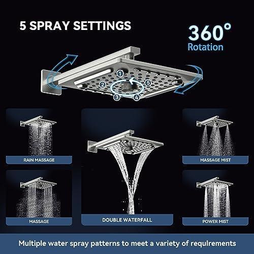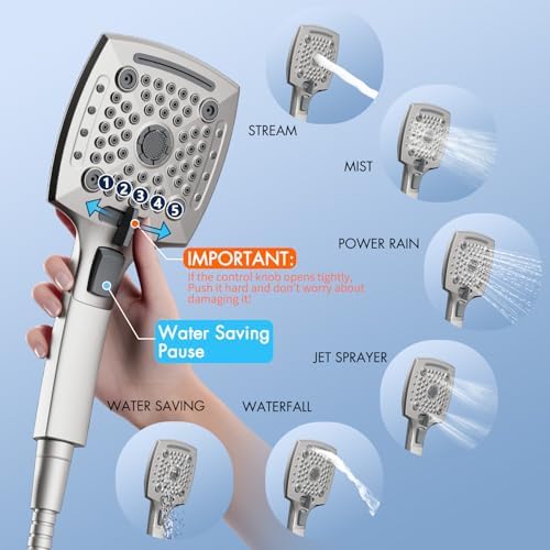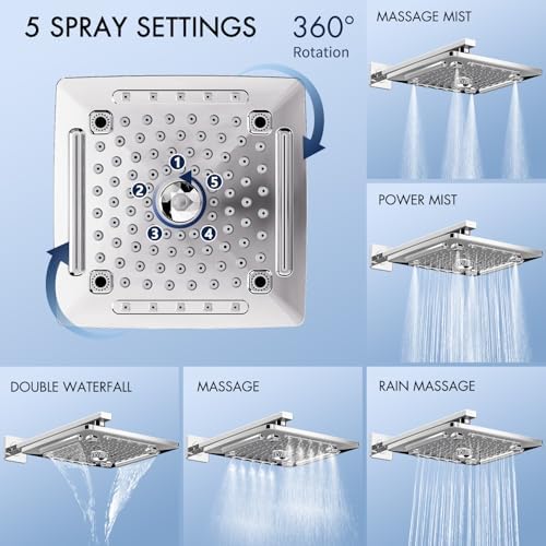 Indulge in the luxurious waterfall shower experience with our oversized 10-inch shower head. Featuring a convenient click lever dial and rub-clean jets, it offers five settings: rain, pulsating massage, waterfall, stay-warm mist, and a pause function for instant on/off flow control. Switch between settings effortlessly for a personalized shower experience.