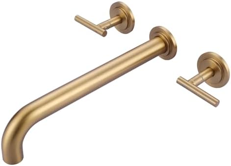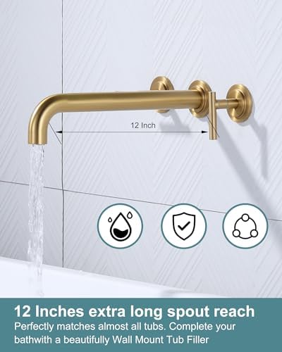 WOWOW Gold Wall Mount Tub Filler – High Flow Solid Brass Faucet with Long Spout Reach & Two Handles – Includes Brass Rou